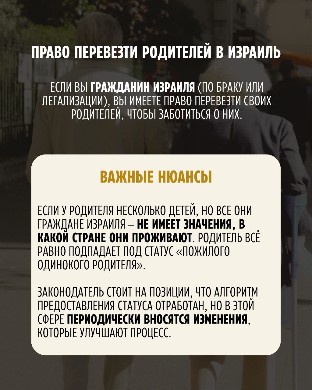 Хорошая новость: в Израиле есть возможность перевезти одинокого пожилого родителя и официально оформить его статус. Более того, недавно были внесены изменения, которые сделали этот процесс понятнее и доступнее.